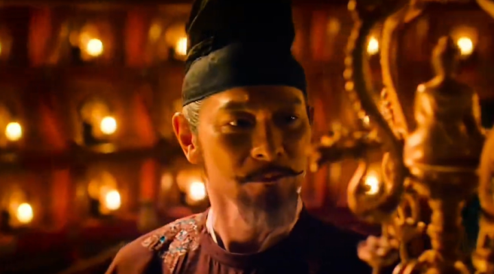 刘德华在影片中饰演杨国忠,是一个位高权重的奸臣,面对皇上身边最得宠的宦官时,他的表情嘲讽,有一种高高在上的傲慢,看起来极为不屑。